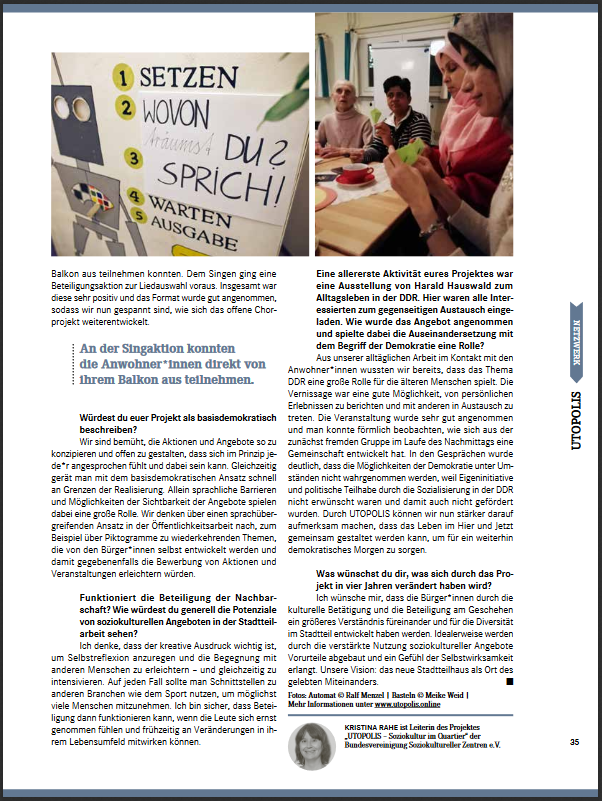 In der aktuellen Ausgabe des Magazins Soziokultur findet ihr ein Interview mit Meike Weid zum Projekt unter dem Schwerpunkt Demokratie: